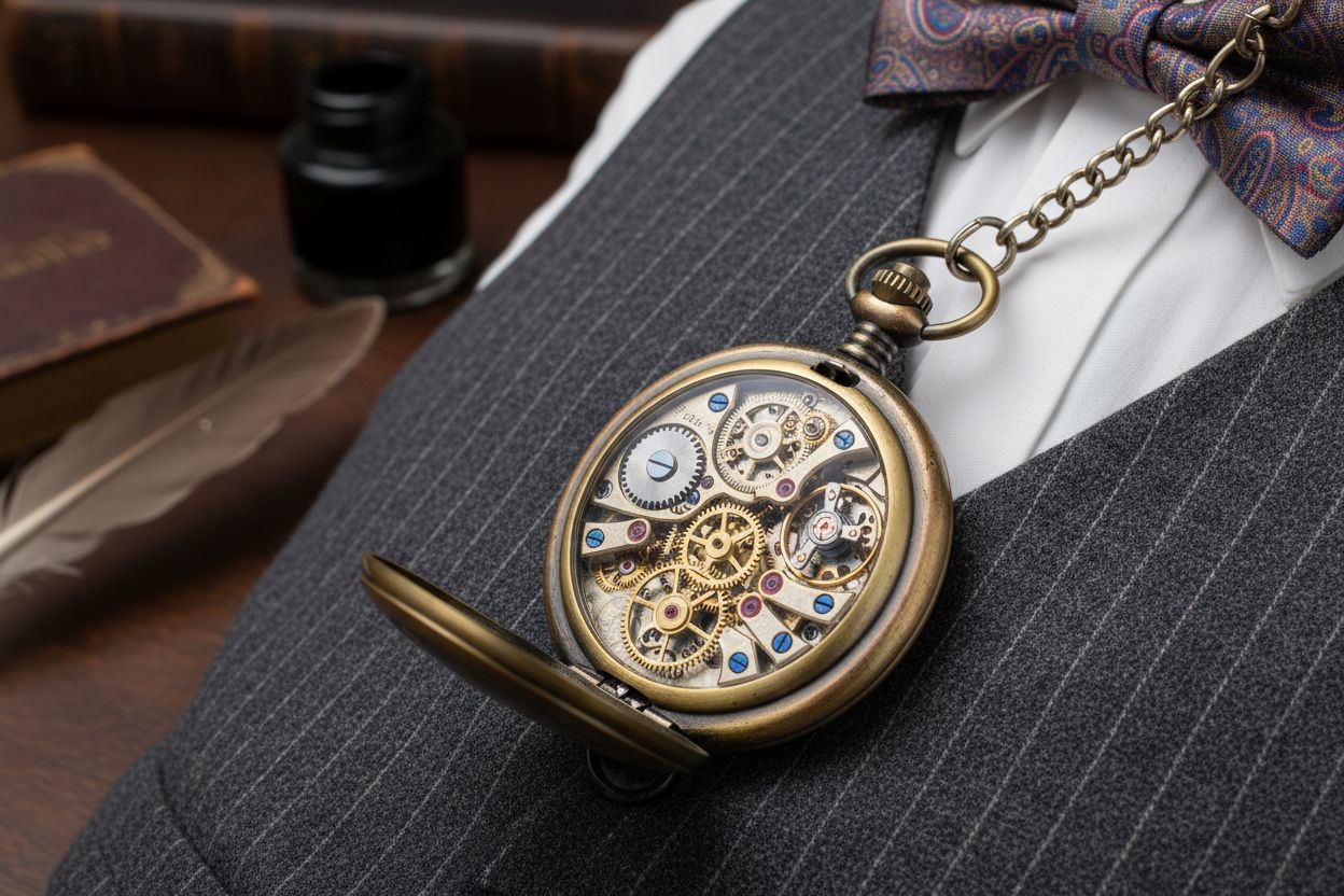 Les montres à gousset steampunk sont souvent ornées de détails tels que des engrenages et des rouages visibles. Elles se marient bien avec des tenues comprenant des boutonnières et des détails métalliques comme des boulons et des ressorts. Ce type de montre est parfait pour ceux qui cherchent un style audacieux et distinctif.